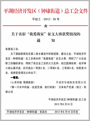 日前,由平湖經(jīng)濟(jì)開(kāi)發(fā)區(qū)(鐘埭街道)總工會(huì)舉辦的“我愛(ài)我家”征文比賽圓滿結(jié)束,我集團(tuán)公司下屬華城制衣有限公司員工易發(fā)采榮登榜首。