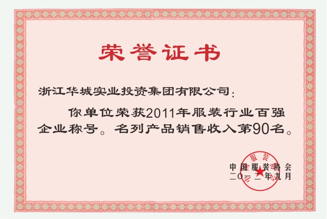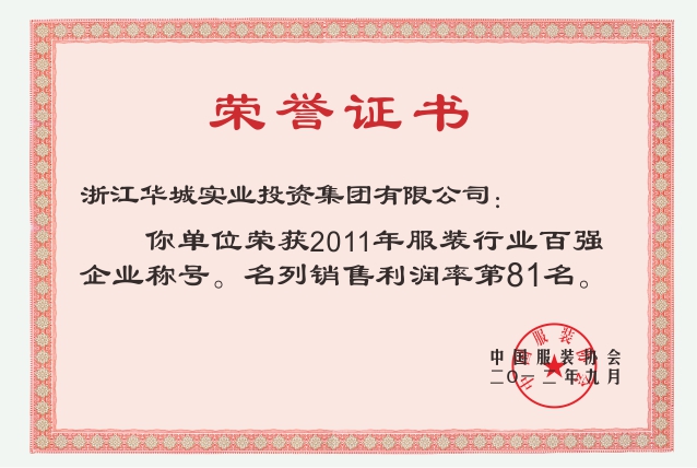 華城集團(tuán)作為平湖服裝行業(yè)的骨干企業(yè),不僅排列于平湖服裝行業(yè)十強(qiáng)之列,而且在今年九月發(fā)布的全國服裝行業(yè)百強(qiáng)企業(yè)排序中,浙江華城實業(yè)投資集團(tuán)有限公司連續(xù)榜上有名,再次榮獲2011年全國服裝行業(yè)百強(qiáng)企業(yè)榮譽(yù)稱號,名列產(chǎn)品銷售收入第90名;利潤總額第90名;銷售利潤率第81名,共三項殊榮,成為嘉興地區(qū)唯一能連續(xù)榮獲全國服裝行業(yè)百強(qiáng)的企業(yè),再次顯示了華城集團(tuán)努力拼搏的成功與輝煌,值得為此而驕傲。華城能連續(xù)多年保持中國服裝百強(qiáng)企業(yè),創(chuàng)下企業(yè)發(fā)展史上前所未有的佳績,榮譽(yù)實為來之不易,尤其是在目前全球經(jīng)濟(jì)形勢依然嚴(yán)峻,市場需求大幅萎縮,不穩(wěn)定因素不斷增多的不利環(huán)境下。這是全體華城員工在董事長的正確領(lǐng)導(dǎo)下,同心同德、奮力拼搏、努力奉獻(xiàn)共同取得的成果。華城人始終堅信服裝企業(yè)生命力的長短來于理念,效益的高低在于管理。我們?nèi)A城從小到大、從弱到強(qiáng)能如此充滿生機(jī)與活力,再一次證明了先進(jìn)的企業(yè)文化是企業(yè)生存和發(fā)展的內(nèi)在動力。文化凝聚人心,文化是動力之源,文化是企業(yè)提升核心競爭力的靈魂。企業(yè)形象靠企業(yè)文化來塑造,企業(yè)聲譽(yù)靠企業(yè)文化來傳播,企業(yè)素質(zhì)靠企業(yè)文化來提高,企業(yè)精神靠企業(yè)文化來培育,企業(yè)品牌靠企業(yè)文化來宣傳。華城企業(yè)文化的形成與發(fā)展,標(biāo)志著企業(yè)已由企業(yè)經(jīng)營正走向經(jīng)營企業(yè)的進(jìn)程。