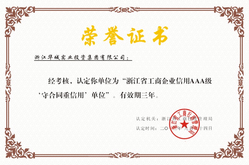 浙江華城實業(yè)投資集團(tuán)有限公司再次被認(rèn)定為“浙江省工商企業(yè)信用AAA級 ‘守合同重信用’單位
