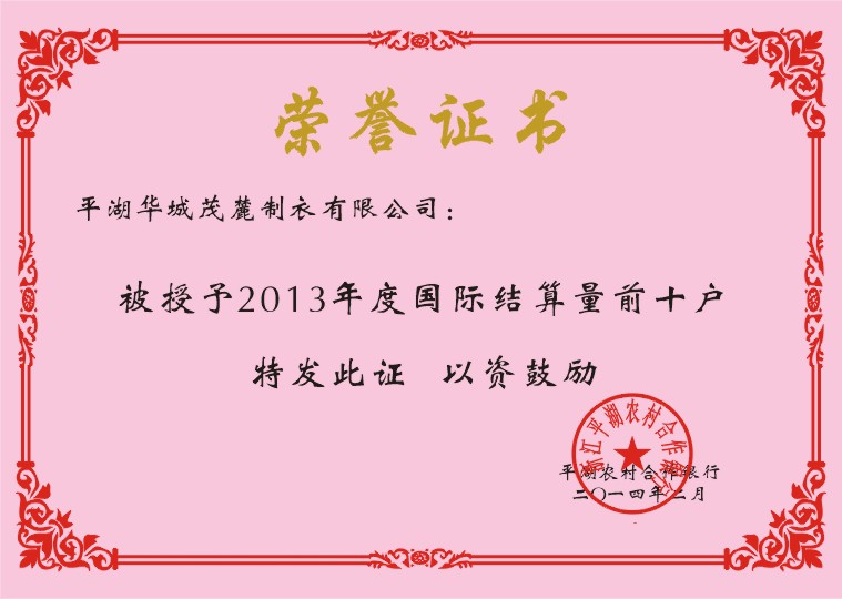 日前,平湖華城茂麓制衣有限公司以突出的業(yè)績,被平湖農(nóng)村合作銀行授予“ 2013年度 國際結(jié)算量前十戶”稱號(hào)。