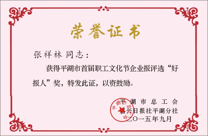 為促進(jìn)企業(yè)報(bào)發(fā)展,推動(dòng)企業(yè)文化建設(shè),日前,平湖市總工會(huì)與嘉興日?qǐng)?bào)社平湖分社聯(lián)合舉辦了平湖市首屆職工文化節(jié)暨企業(yè)報(bào)“三好”評(píng)選活動(dòng),我公司董事長(zhǎng)張祥林榮獲平湖市首屆職工文化節(jié)企業(yè)報(bào)評(píng)選“好報(bào)人”稱號(hào)。