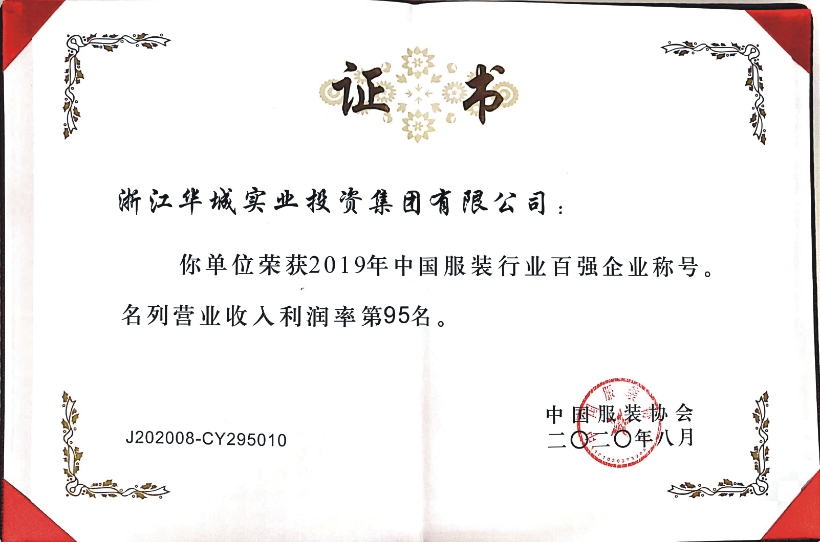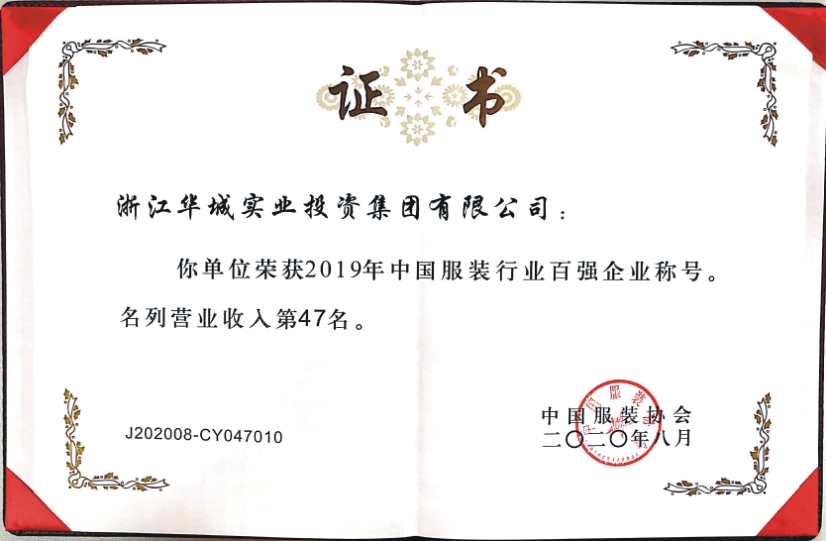 2020年8月,中國服裝協(xié)會正式發(fā)布“2019年服裝行業(yè)百強企業(yè)”名單。我集團公司以“營業(yè)收入第47名” “利潤總額第73名”“營業(yè)收入利潤率第95名”再次榮登中國服裝行業(yè)百強企業(yè)行列,這已是我公司第15次獲此殊榮。