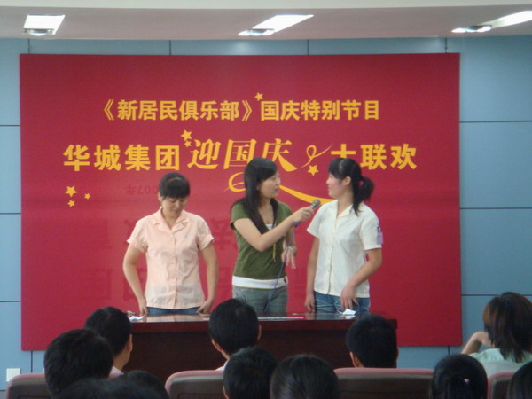 為了慶祝中華人民共和國建國五十九周年,平湖電視臺生活頻道“生活1+1”欄目組聯(lián)合華城集團工會、集團團總支于9月25日在華城集團總部共同舉辦一期名為“新居民俱樂部,迎國慶大聯(lián)歡”的主題活動。公司工會主席沈文英、《華城報》總編凌中強等領導參加此次活動,本次活動邀請華城集團下屬五個分公司員工代表前來參加。