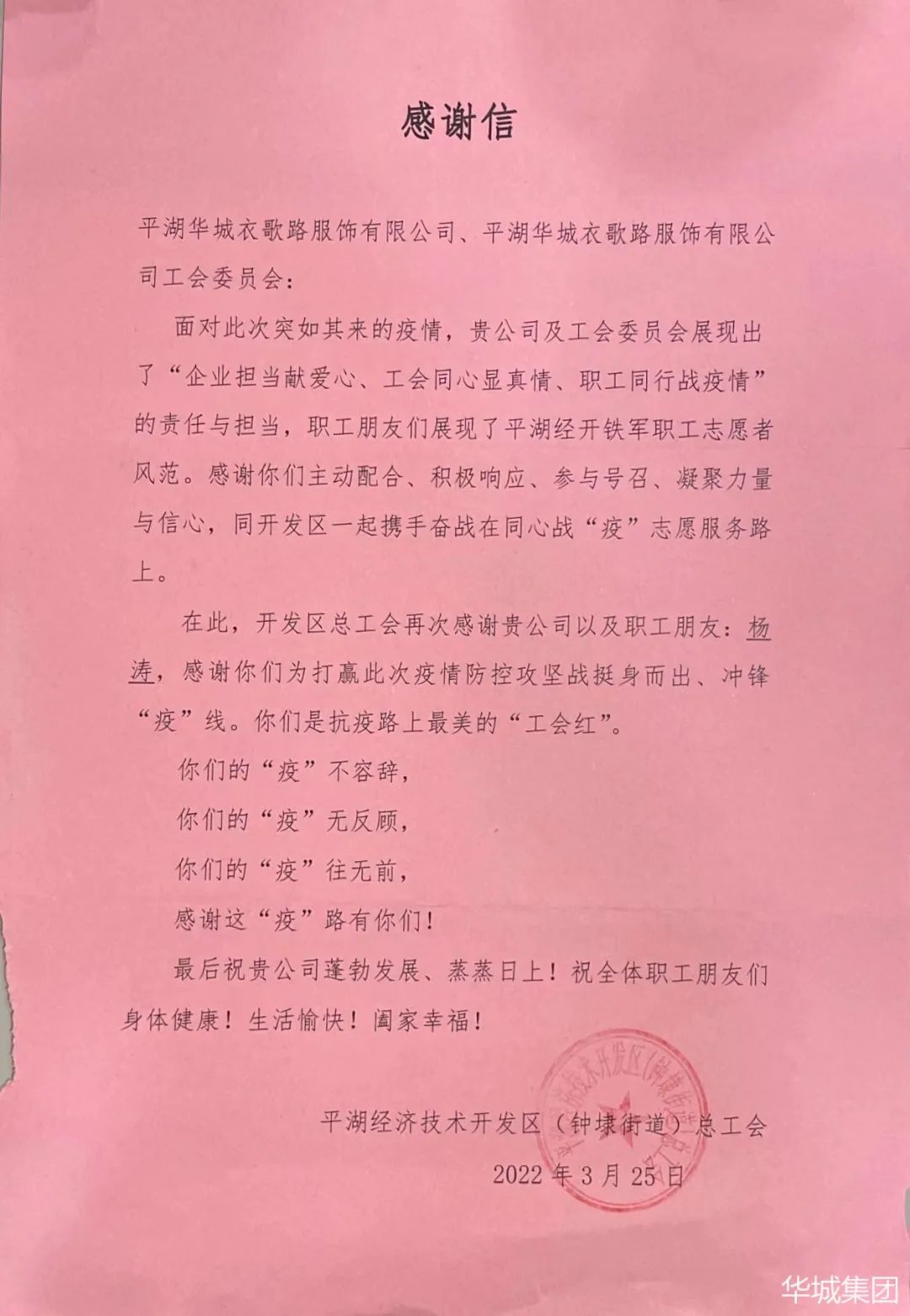 來信對華城衣歌路及其工會,在疫情防控工作中所作的貢獻給予高度的評價與感謝。信中肯定和表彰了企業(yè)克服現(xiàn)實中的重重困難,在第一時間積極展開抗“疫”行動,企業(yè)擔當獻愛心,工會同心顯真情,職工同行戰(zhàn)疫情。