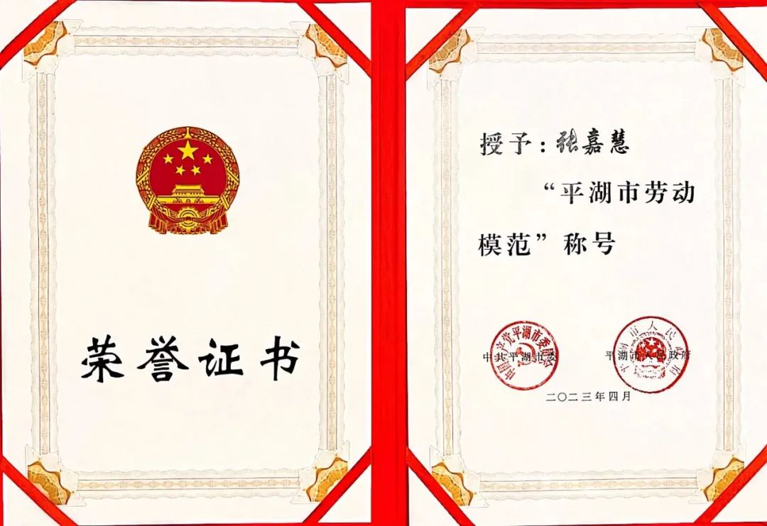 當(dāng)前位置:首頁 > 華城動(dòng)態(tài)向勞模致敬,為先進(jìn)點(diǎn)贊。4月28日上午,平湖市慶祝“五一”國際勞動(dòng)節(jié)暨勞動(dòng)模范和先進(jìn)集體頒獎(jiǎng)儀式隆重舉行。會(huì)上,表彰了2018-2022年全市各行各業(yè)涌現(xiàn)出的勞動(dòng)模范和先進(jìn)集體。我公司董事長(zhǎng)助理張嘉慧被授予“平湖市勞動(dòng)模范”榮譽(yù)稱號(hào)。