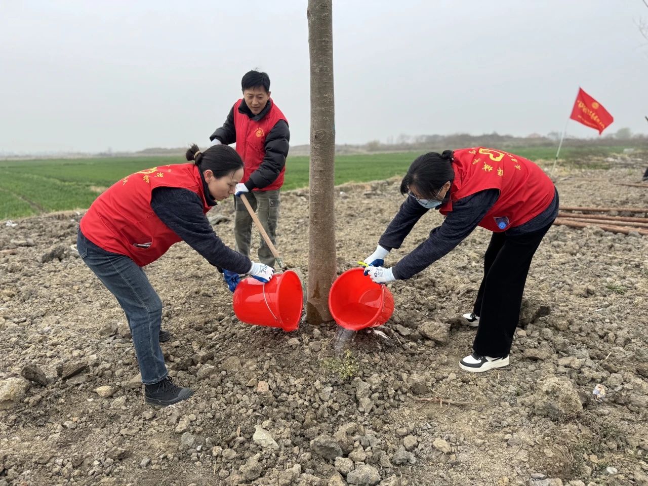 大家干勁十足,分工協(xié)作,配合默契。有的揮鍬鏟土,有的扶樹填坑,有的提水澆灌,每一個步驟一絲不茍。由于要種的樹都比較大,推樹入坑非常費力。每種一棵樹,都要集團隊力量。大家一起吶喊加油,使足力氣,春意寒涼中,額頭都沁出了汗珠。多種一棵樹,就多一份快樂。